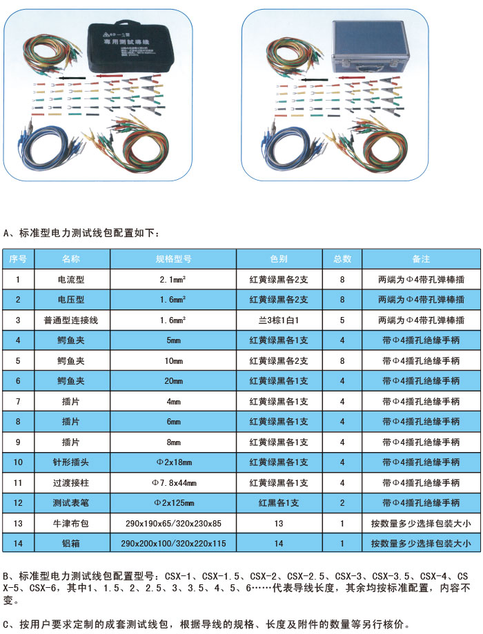 ?CSX系列電力試驗專用測試導線包是電力系統(tǒng)繼電保護專用實驗線,廣泛適用于繼電保護現(xiàn)場、實驗室及其它實驗場所,并同樣適用于儀器儀表進行電氣配套測試等場合。